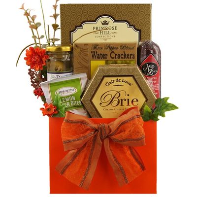 Send your fall greeting across the miles to celebrate the season of color. This delightful fall gift is filled with your more hearty traditional foods like meat and cheese are sure to make them smile. Designed within an beautiful orange container it leads to a more adorable festive gift that is very suitable for family, friends, coworkers and so many more. Tell them Happy Fall with this beautiful gift.