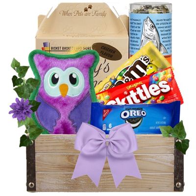 Know a canine that’s a real hoot? Well, this is the perfect gift for that funny-fun-loving dog that you know that always brings a bright smile to your face or the owners. Filled with only good nutritious treats for the dog and our favorite candy for the owner, this gift also has a purple plush owl that dogs just love to toss around. This gift is perfect for any gifting occasion.